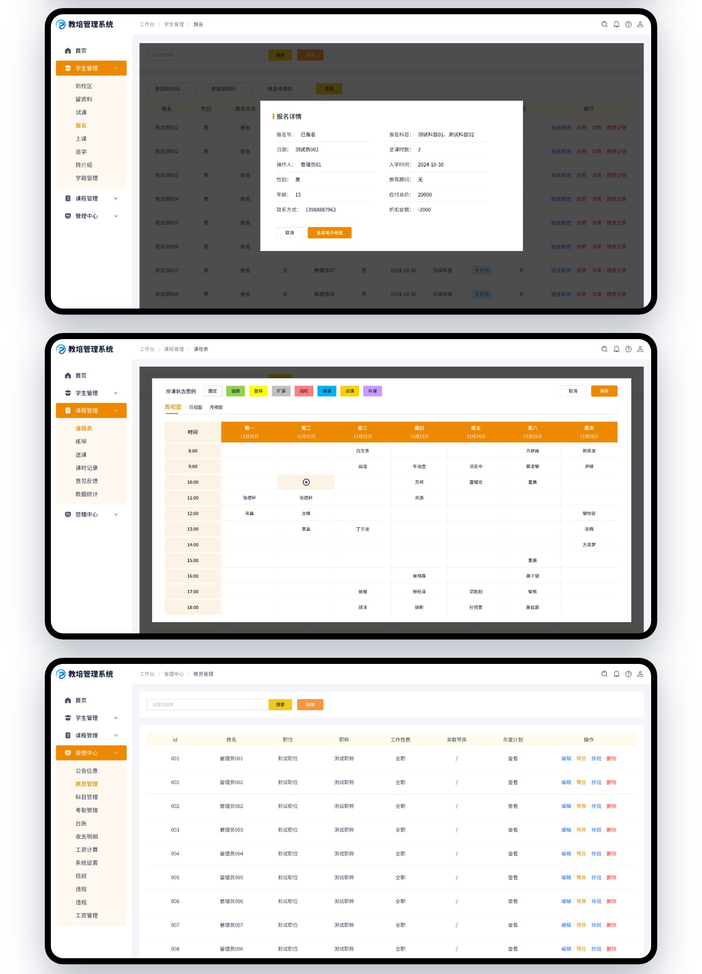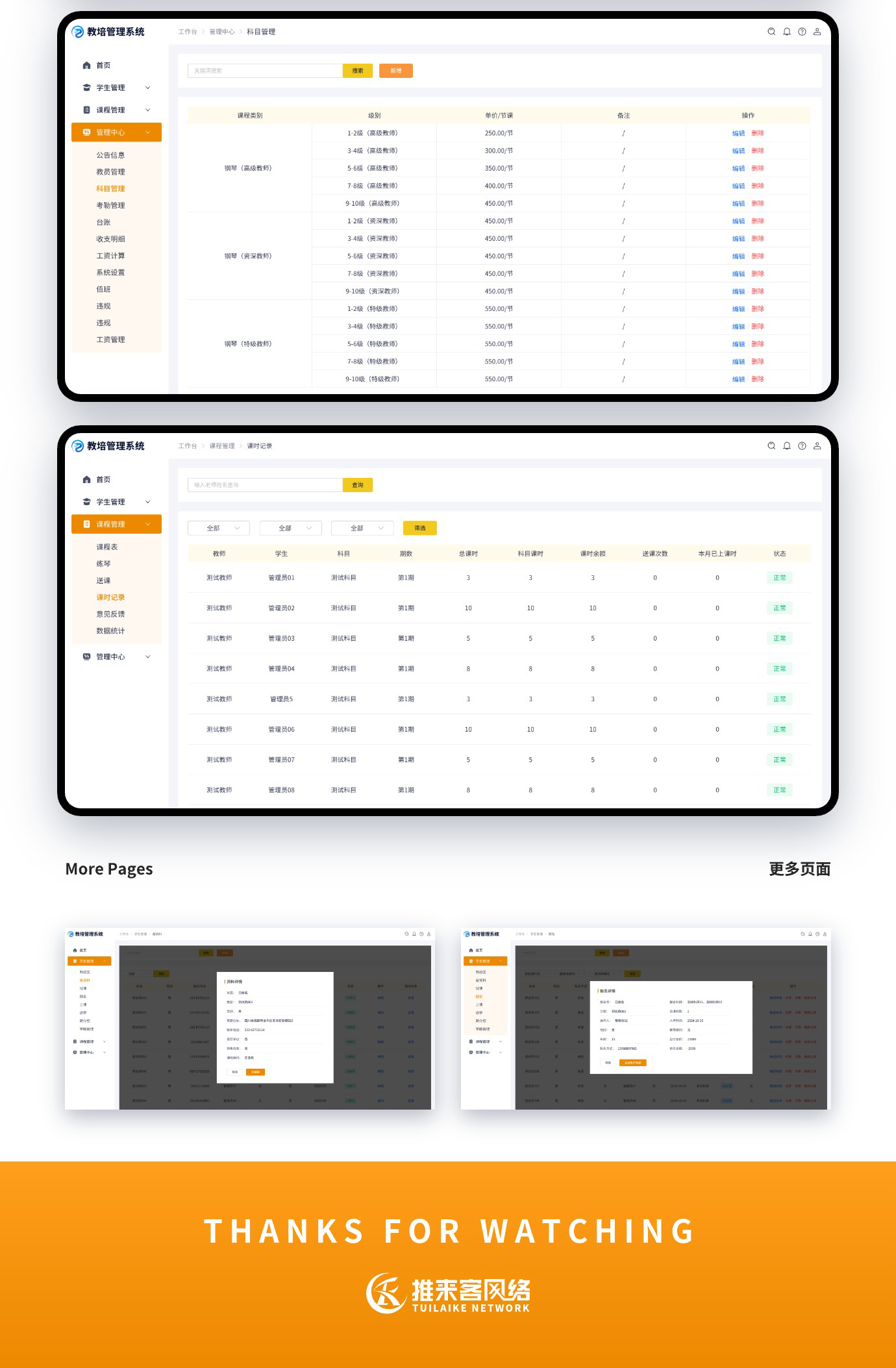 這是我們給廣東以為客戶開發的教培管理系統,功能不算復雜,常規的排課系統、財務管理、人事管理、資料管理、學籍管理、課程管理都是有的。目前第一階段只開發了PC管理端,如果運營能達到預期會進入第二期小程序端或者APP端開發。